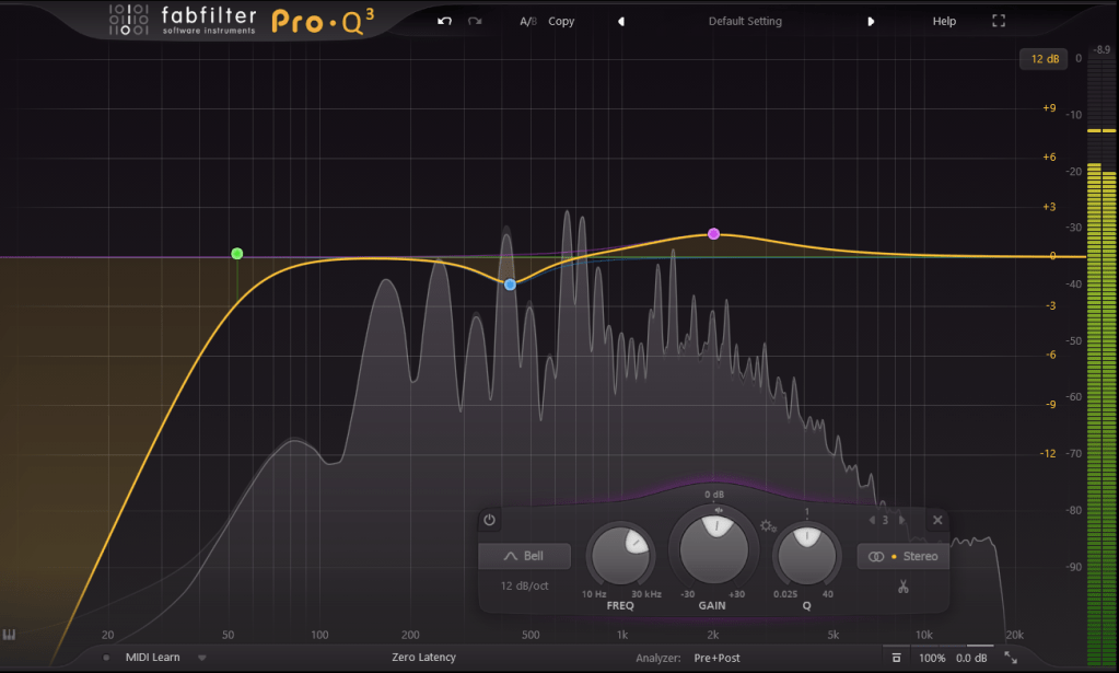 Les cloches ou bells permettent de cibler une fréquence particulière afin de l’accentuer ou la réduire. Elle agira également, dans une moindre mesure sur les fréquences alentours. Ici, la largeur de bande est souvent plus large que celle d’un notch pour un résultat plus musical.