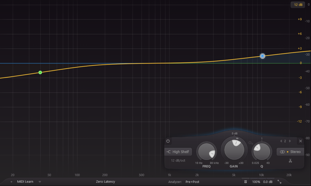 Il est possible avec un shelf de diminuer et d’augmenter toute une plage de fréquences. Ce genre de filtres est utile pour rééquilibrer une balance tonale. Ils trouvent parfaitement leur place dans un contexte de mastering où l’on égalise l’ensemble d’un mixage.
