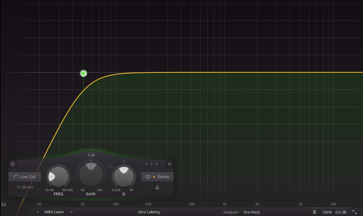 Les high pass filters, aussi appelés HPF, coupe-bas ou passe-haut, sont des filtres permettant d’atténuer les basses fréquences. L’atténuation suit une pente plus ou moins prononcée. Une pente de 6 dB par octave implique une réduction de 6 décibels à chaque fois que la fréquence de coupure est divisée par 2. Ce filtre est idéal pour laisser place à la basse ou au kick dans un morceau.