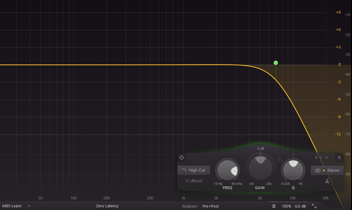 À l’inverse des filtres précédents, les low pass filters, LPF, coupe-haut ou passe-bas permettent d’atténuer les hautes fréquences. Tout comme les HPF, l’atténuation suit une pente. Ici, une pente de 6 dB par octave implique une réduction de 6 décibels par doublement de la fréquence de coupure. Appliquer ce genre de filtres permet parfois de calmer certains sons aigus trop agressifs.