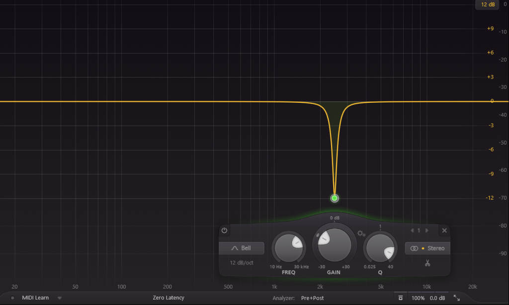Si une fréquence particulière vous gêne (une résonnance par exemple), vous pouvez utiliser un notch pour l’atténuer au maximum. Le notch se caractérise par une largeur de bande (Q) extrêmement réduite pour précision d’action chirurgicale.