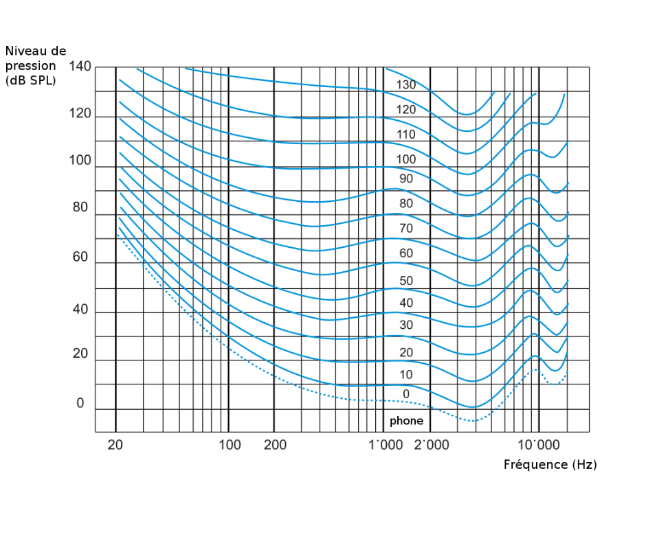 Pour illustrer cette idée, on peut citer les travaux de Fletcher et Munson qui montrent qu’en variant le volume, nous percevons différents équilibres de la plage de fréquences audibles. Les basses, par exemple, se perdent à un niveau d’écoute faible. On recommande souvent une écoute studio entre 70 dB et 85 dB (le seuil de fatigue auditive) pour percevoir une représentation équilibrée du spectre audio.