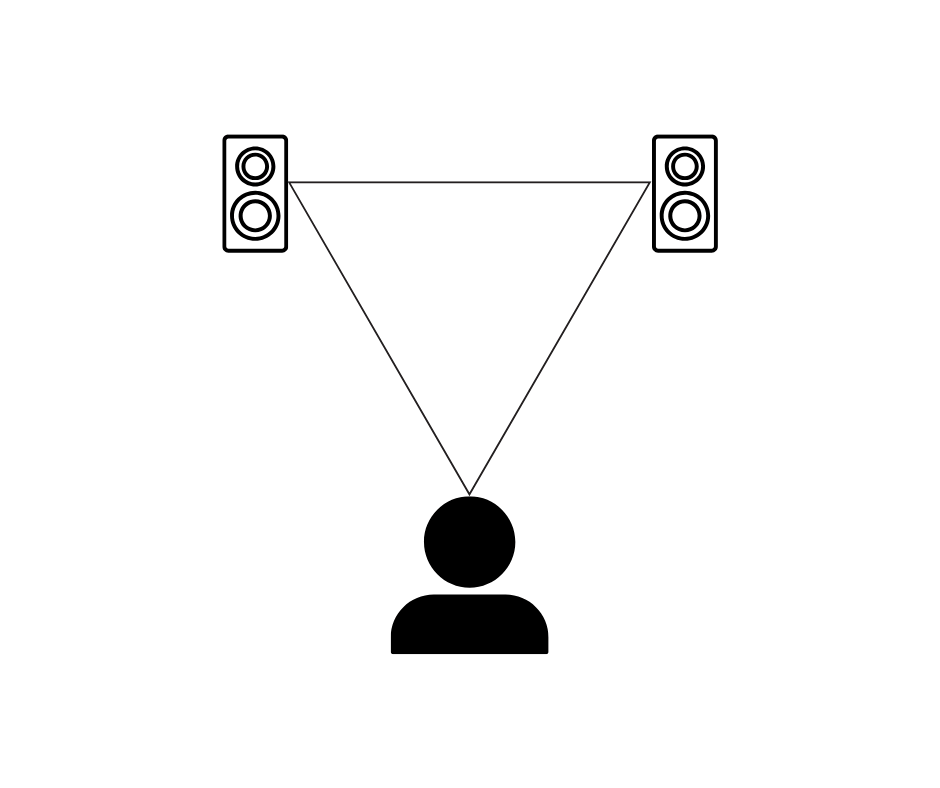Dans ce même souci de symétrie, vous devez former avec vos enceintes les trois sommets d’un triangle équilatéral. Les enceintes sont placées à la verticale et sont tournées vers votre tête. En plaçant le haut-parleur d’aigus (dit « tweeter ») à hauteur des yeux, vos oreilles devraient se trouver à distance équivalente des hautes et basses fréquences.